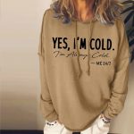 Say it all with this super-cozy classic crew neck top and layer it with a cami underneath for added warmth. The black printed words,” YES, I’M COLD, I’M ALWAYS COLD ME 24/7,” in bold font make sure you always keep it casual and cool. The classic round neck collar, capped long sleeves, and waist-length fit gives this khaki-tan sweatshirt a muted style perfect for work, home, and any place else. Machine wash normal with light colors or hand wash. May be hung up to dry or lay flat. Light ironing if needed.