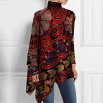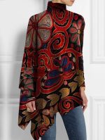 Add this rustic mock neck top to your winter wardrobe and beyond with its autumn orange-red, yellow, and blue hues, giving it the perfect fall look any time. The mock neck keeps you cozy and warm, perfect for layering over a shirt, camisole, and so much more. The unique pattern exudes an artisan quality to this versatile asymmetrical hem long sleeve top for the winter months.