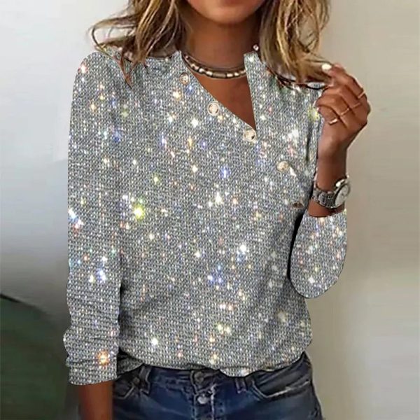Make your Christmas and holiday memories picture-perfect by wearing this all-over silver metallic print top. This disco-ready Christmas tinsel top features long sleeves and a v-neck collar, making it versatile enough to layer with a cami underneath and your favorite jacket on top.