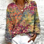 Add a dash of artistry to your day or night wardrobe with this pretty top. A beautiful watercolor ombre shading and eye-catching square paint dots light up any look with rainbow color. The v-neck, long sleeves, and waist-length fit keep it cool and casual, just in time for the new season. Machine wash normal with light colors or hand wash. May be hung up to dry or lay flat. Light ironing if needed.