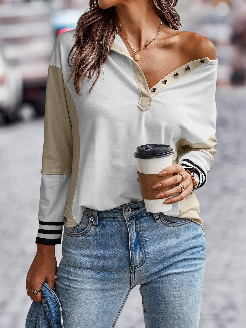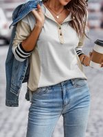 This retro 90s top is right on-trend with its fitted long sleeves and henley style. A round collar with v-neck and button front makes it super-easy to mix and match with other shirts or a camisole underneath for a layered look. A black and white vertical stripe trim gives this casual shirt a laid-back vibe, perfect for pairing with black leggings or jeans.