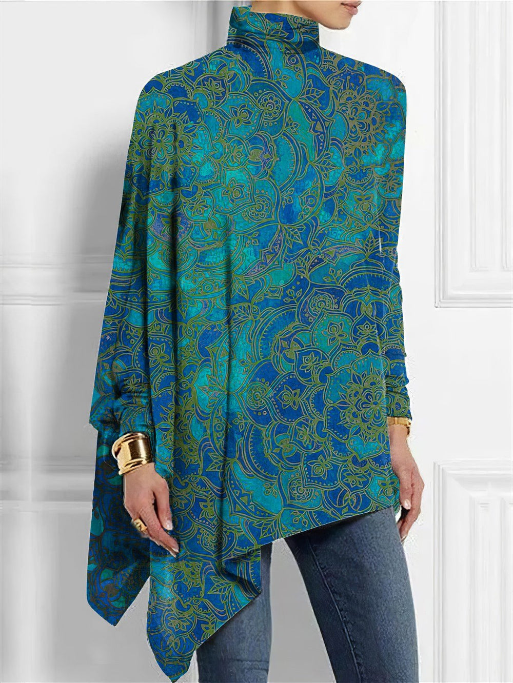 Add oceanic beauty with this green-to-blue watercolor/ombre mock neck top. The long sleeves and asymmetrical hem give this top a look that is elegant yet right on trend. A golden-yellow ornate paisley print exudes glamor, making this unique high-neck top your newest favorite for your winter wardrobe.