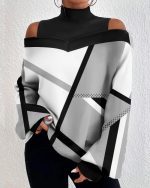 This contemporary top features a cold shoulder top with a turtleneck, giving it a sultry look perfect for the winter season and cooler days. Gray, black, and white color block stripes collide with abstract artistry, making this sophisticated top the main focal point of any outfit. Wide long sleeves keep you cozy.