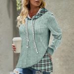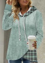 This pretty mint green long sleeve sweatshirt top features a cozy rib knit and plaid twofer style, giving it the illusion it is layered with different textures and prints. A double-drawstring hoodie and waist-length fit make this laid-back hoodie extra versatility for cooler days and windy nights.