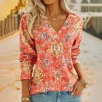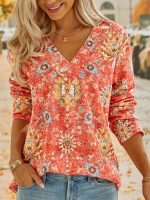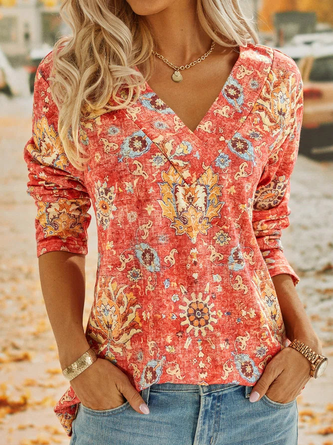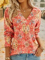 Add chic style to your summer with this v-neck top featuring an orange-red rustic flower pattern with short sleeves and a versatile waist-length silhouette. Finish your outfit with cut-offs, jeans, or leggings for a vintage meets modern trends moment.