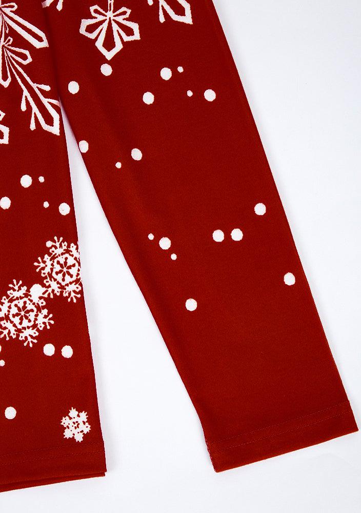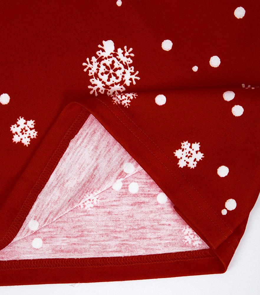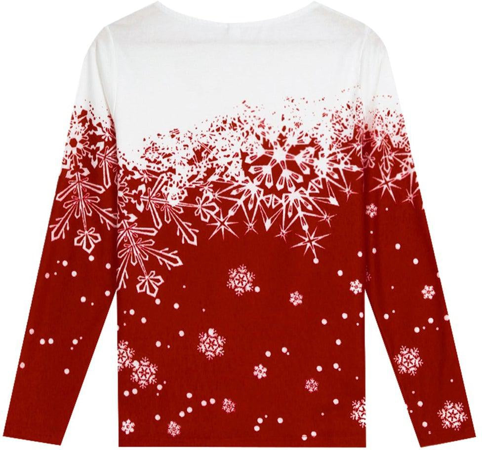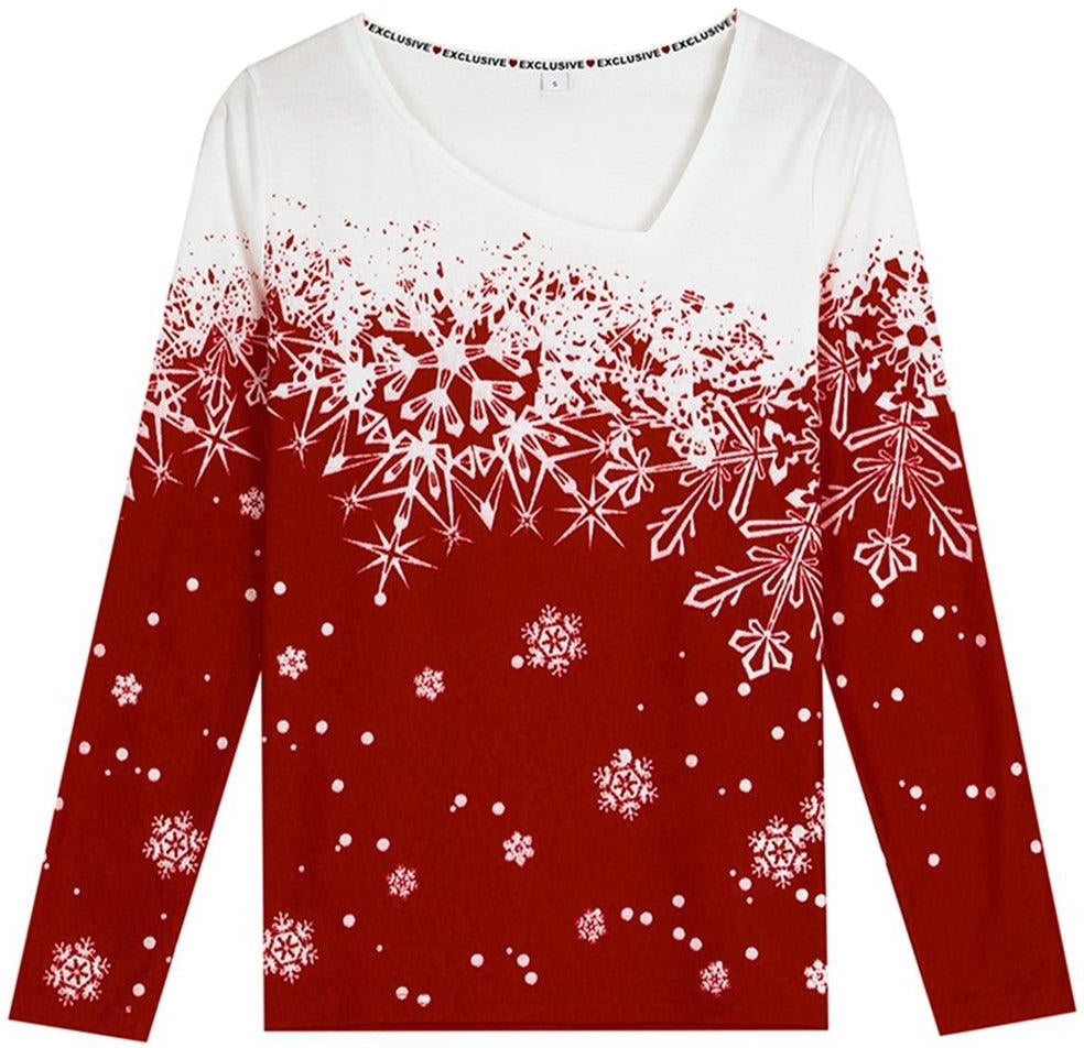 This bright white and red long-sleeved holiday top demands attention with its elegant style. A boxy asymmetrical collar and color block cherry red and white falling snowflake design makes a statement in modern sophistication. Wear this picture-perfect Christmas top to work, a casual day out, or a night under the stars. Machine wash normal with light colors or hand wash. Bleach if needed. May be hung up to dry or lay flat. Tumble dry with low heat. Light ironing if needed.