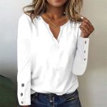 Get back to basics with this simple long sleeve button front top, ideal for layering with a camisole or a jacket and worn with your favorite pair of leggings, a skirt, or jeans. The waist-length fit and lightweight feel will take your day look into the night with effortless style. The round collar with v-neck pairs well with necklaces. Machine wash normal with light colors or hand wash. May be hung up to dry or lay flat. Light ironing if needed.