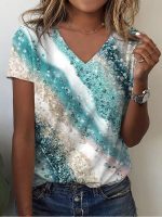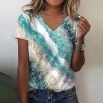 Get beach ready any time with this tropical beach marbled print top. Green, yellow-gold, and white add glam style to your day or night wardrobe. The v-neck and short sleeves make it perfect for pairing with any jacket or worn solo.
