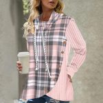 Two looks in one with this trendy gray and pink plaid drawstring hoodie, lightweight enough for year-round wear and perfect for the cooler seasons. Ribbed cotton candy pink knit with buttons collide with a classic checked pattern, giving this long sleeve top a layered style. Finish your outfit with a plain t-shirt underneath or a cami.